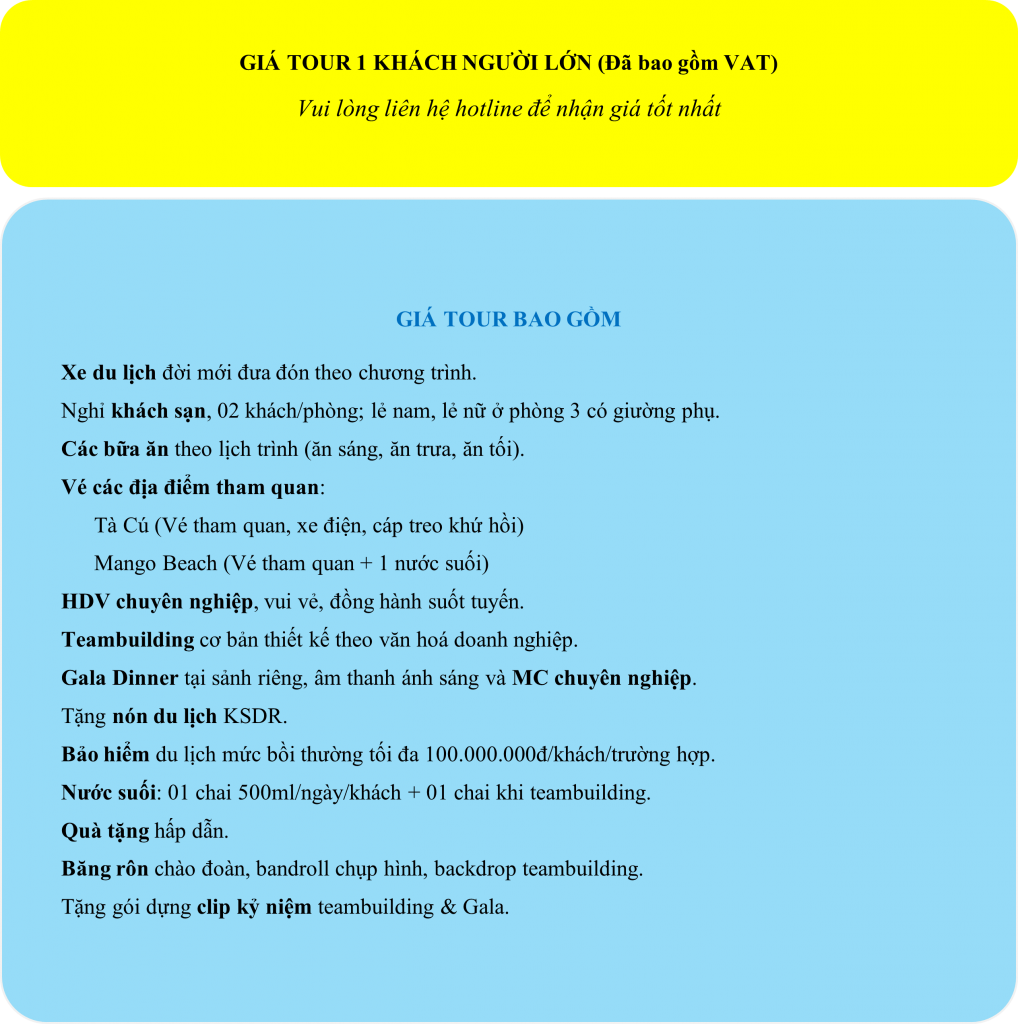 Cảm ơn Quý khách đã tham khảo chương trình tour của Khách Sạn Đây Rồi Travel. Chúng tôi sẵn sàng thiết kế hành trình theo nhu cầu riêng để teambuilding và đêm Gala Dinner thêm gắn kết, để mỗi khoảnh khắc đều là một dấu ấn đáng nhớ.